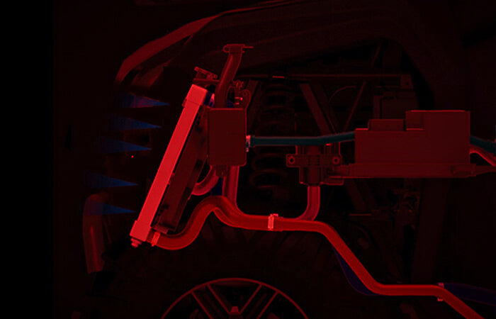 Visiškai reguliuojami dujiniai-skysčiu užpildyti amortizatoriai su atskiru kanistru ir progresyvios spyruoklės su reguliuojama išankstine apkrova: rezultatas – puiki kelionė, puikus valdomumas ir pasitikėjimas savimi įveikiant sudėtingiausias vietoves.